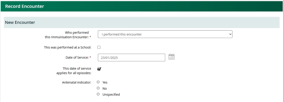 Note: Software providers have until October 2025 to update their software to include the antenatal indicator field and remove the ‘Antenatal’ option from the Vaccine type field.